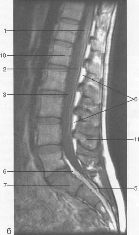 1 -- конус спинного мозга; 2 -- конский хвост спинного мозга; 3 -- субарахноидальное пространство; 4 -- дуральный мешок; 5 -- терминальная нить; 6 -- эпидуральное пространство; 7 -- тело Sp 8 -- пульпозное ядро межпозвонкового диска; 9 -- фиброзное кольцо межпозвонкового диска; 10 -- каналы бази-вертебральных вен; 11 -- остистый отросток LIV.