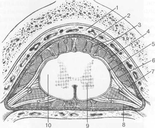 1 -- эпидуральная клетчатка; 2 -- твердая мозговая оболочка; 3 -- паутинная мозговая оболочка; 4 -- субарахнои-дальное пространство; 5 -- мягкая мозговая оболочка; 6 -- задний корешок спинномозгового нерва; 7 -- зубчатая связка; 8 -- передний корешок спинномозгового нерва; 9 -- серое вещество; 10 -- белое вещество.