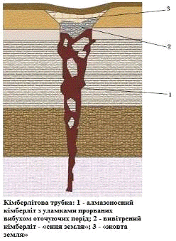 Згідно запропонованої моделі, кімберлітові трубки - це особливий тип вулканів, корені в глиб Землі, досягаючи межі земної кори і мантії (рис. 6). Кімберліти складаються в основному з силікатів заліза (олівіну і флогопіту), а алмази в них є чужими (ксеногенними) мінералами. Кристали алмазів ростуть в мантії, в середовищі, насиченою летючими компонентами, протягом декількох мільйонів років, а потім виносяться на поверхню кімберлітами. Алмази - стародавні мінерали, вони істотно старше вміщають їх кімберлітів. Їх вік (більше 3 млрд років) відповідає віку порід, що складають фундамент континентальних кратонів.[10]