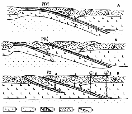 А - ситуація в кінці раннього протерозою; Б - на рубежі раннього і середнього протерозою; В - в рифеї або фанерозої (показаний момент прориву глибинної магми до поверхні і утворення: а - лужно-ультраосновних інтрузій, б - меллілітових і в - алмазоносних лампроїтових або кімберлітових субвулканічних комплексів). 1 - літосфера; 2 - астеносфера; 3 - ранньопротерозойська океанічна кора з перекриванням її важкими залозистими опадами; 4 - континентальна кора (AR - архейского, PR1 - ранньопротерозойского віку), 5 - глибинні розплави.