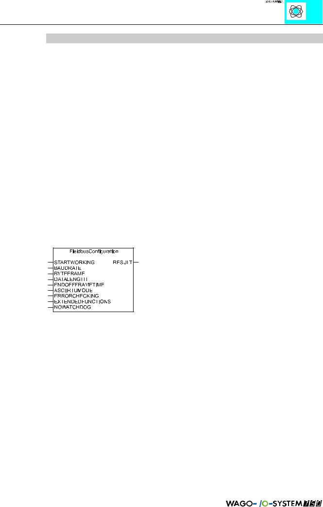 O ajuste do controlador é efetuado por software com o bloco de funções ‘FieldbusConfiguration’ da biblioteca WAGO-I/O-PRO. Se este módulo for transferido para o programa de comando, o ajuste automático também é efetuado após a substituição do controlador. Os ajustes são transferidos para o conjunto de parâmetros do controlador. Se os valores pretendidos não estiverem já ajustados, é efetuado automaticamente um reset do Firmware no modo bus e o controlador arranca novamente com os ajustes selecionados.