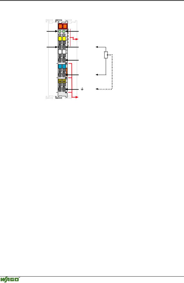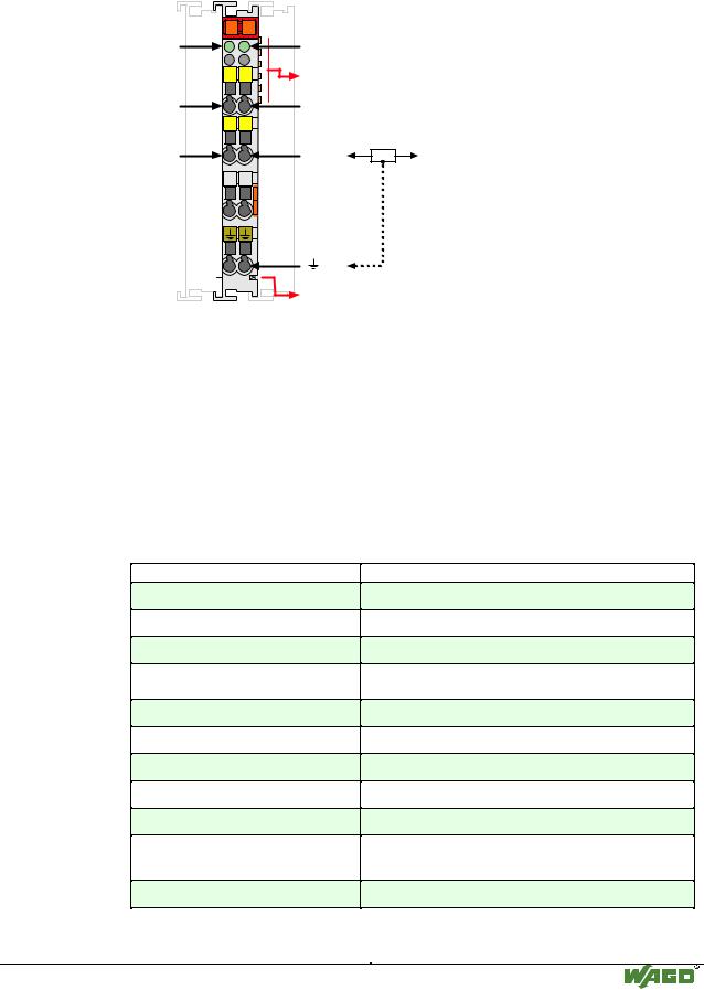 Die Zufü hrung erfolgt ü ber eine vorgeschaltete Einspeiseklemme fü r die jeweilige Betriebsspannung. Ü ber die internen Leistungskontakte erfolgt dann mit Anrasten der Eingangsklemmen eine automatische Durchkontaktierung des Versorgungspotentials. Ein Anschlusspunkt dieser Kontakte ist direkt mit dem UB+ Potential verbunden.