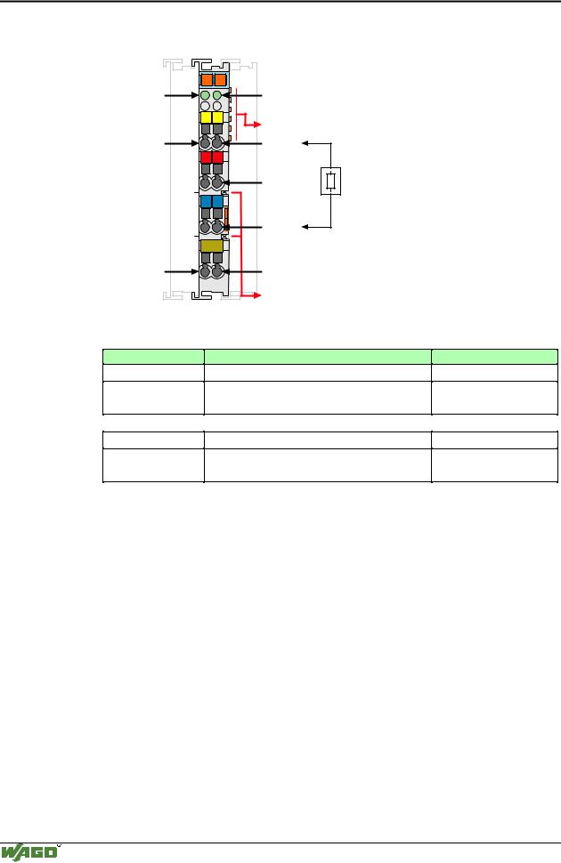 Die Versorgungsspannung von DC 24 V wird ü ber die Leistungskontakte an die Busklemme gefü hrt. Soll die Versorgungsspannung galvanisch getrennt zugefü hrt werden, ist eine entsprechende Einspeiseklemme (z.B. 750-602) vorzuschalten.