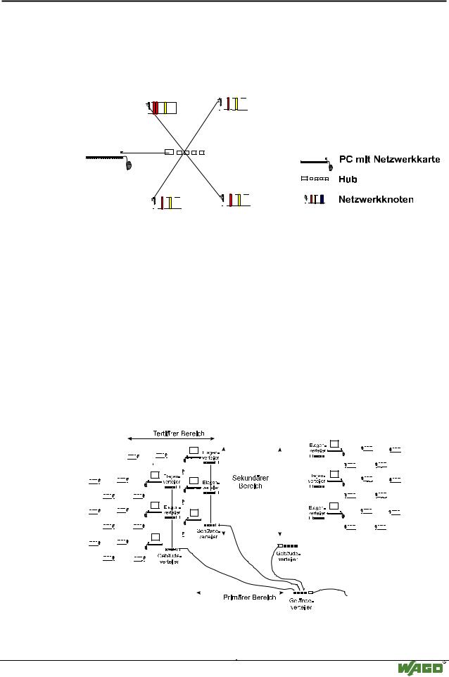 Bei der Stern-Topologie handelt es sich um ein Netz, an dem alle Stationen mit einem zentralen Knoten verbunden sind. Dazu wird ein Hub wie ein normaler Rechner an eine Bus-Architektur angeschlossen, bzw. verläuft der Bus innerhalb des Hubs.
