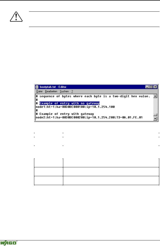 Diese Tabelle stellt die Datenbasis fü r den BootP Server dar. Im Anschluss an die Auflistung aller Kü rzel, die in der BootP-Tabelle verwendet werden kö nnen, finden Sie ganz am Ende zwei Beispiele fü r die Vergabe einer IPAdresse.