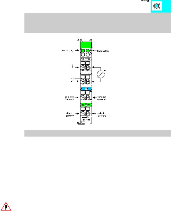 The inputs are connected to +I and -I. The shield is connected to „S“. The connection is made automatically when snapped onto the DIN rail.