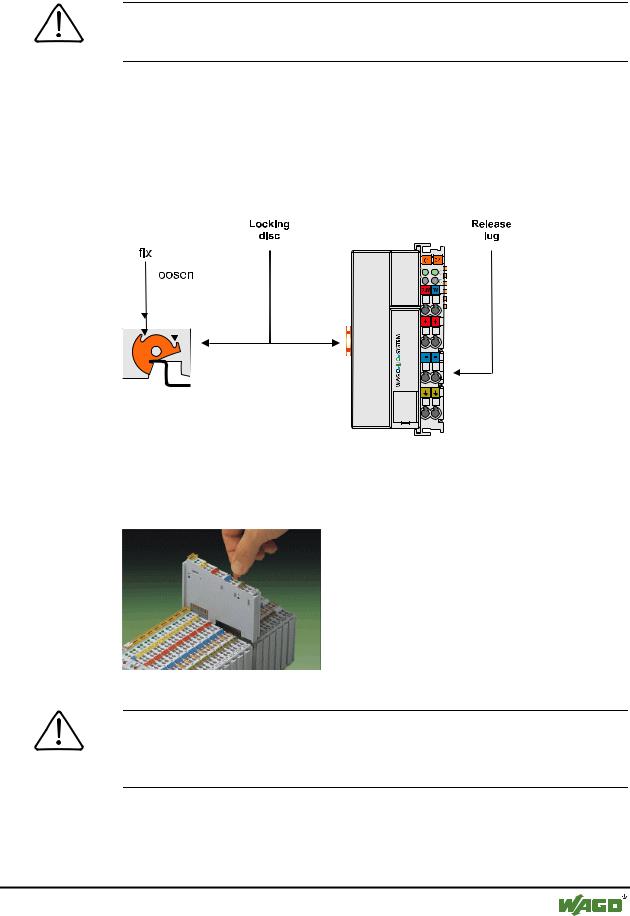 To pull out the fieldbus coupler/controller, release the locking disc by pressing on the bottom groove with a screwdriver and then pulling the orange colored unlocking lug.