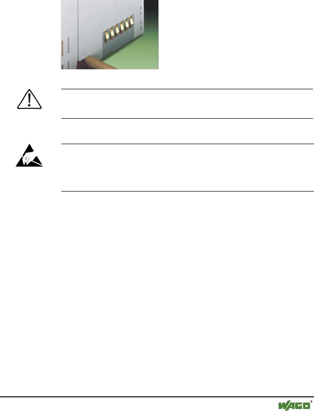 Never plug bus modules from the direction of the end terminal. A ground wire power contact, which is inserted into a terminal without contacts, e.g. a 4-channel digital input module, has a decreased air and creepage distance to the neighboring contact in the example DI4.