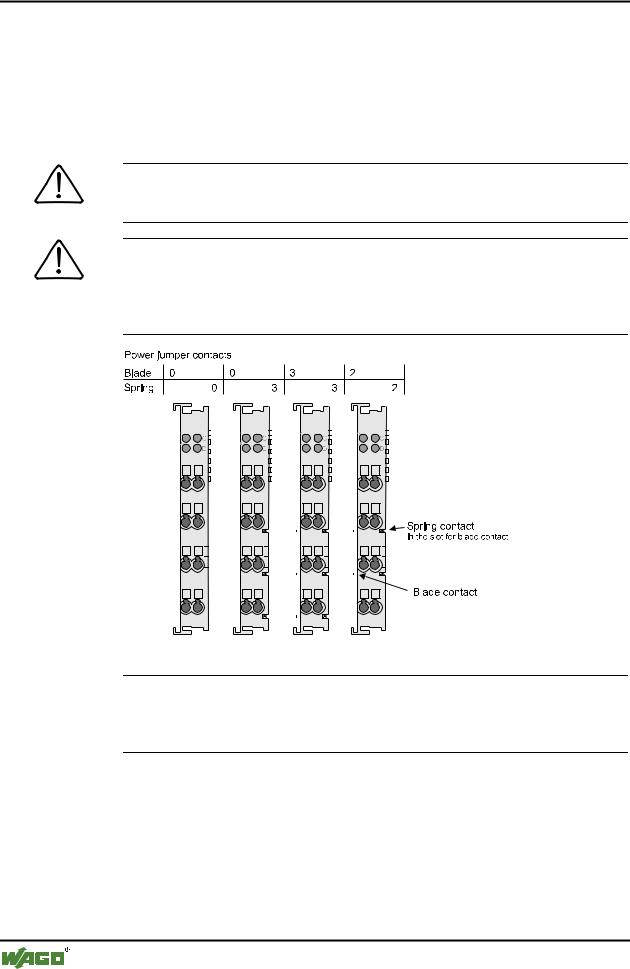Self-cleaning power contacts , are situated on the side of the components which further conduct the supply voltage for the field side. These contacts come as touchproof spring contacts on the right side of the coupler/controller and the bus module. As fitting counterparts the module has male contacts on the left side.