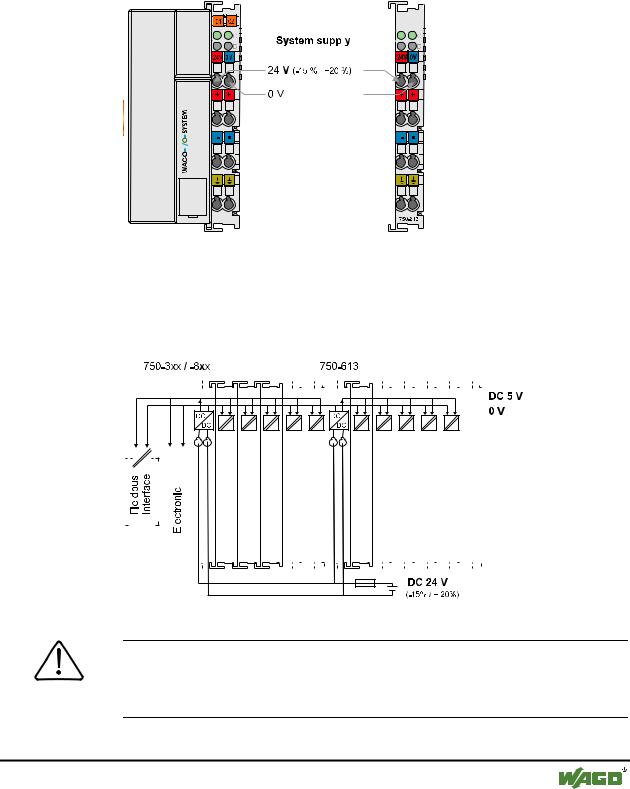 The WAGO-I/O-SYSTEM 750 requires a 24 V direct current system supply (-15% or +20 %). The power supply is provided via the coupler / controller and, if necessary, in addition via the internal system supply modules (750-613). The voltage supply is reverse voltage protected.