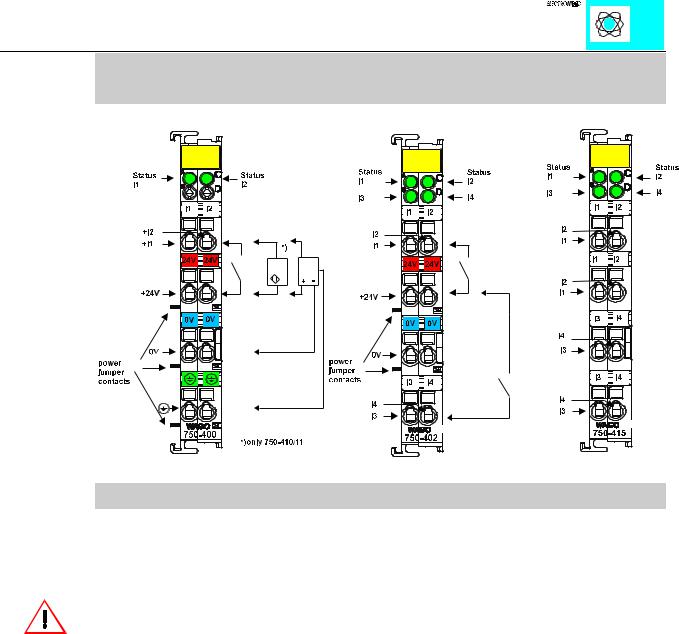 The lowest power jumper contact is not carried out for some modules (e.g. 4-channel)! A module which needs all contacts (e.g. 2 channel digital) may not be connected to the right hand side of modules which do not have 3 power jumper contacts (e.g. 4 channel modules).