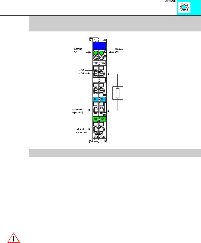 The output signal of 750-556 is a +/- 10 V signal. Sensors may be connected to „O“ and to the common ground (0V).
