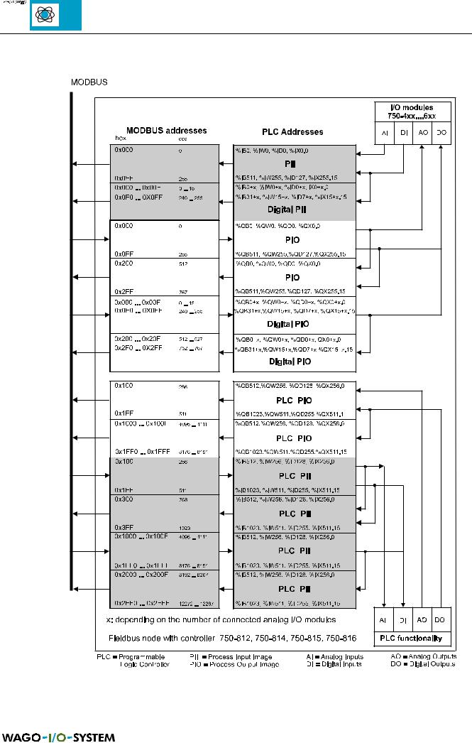 ∙Addressing of the I/O modules which occupy one or two bits per channel is also made word for word. 16 inputs or outputs each are arranged in one word. If less channels are available the remaining bits of the word remain free or are reserved for extensions.