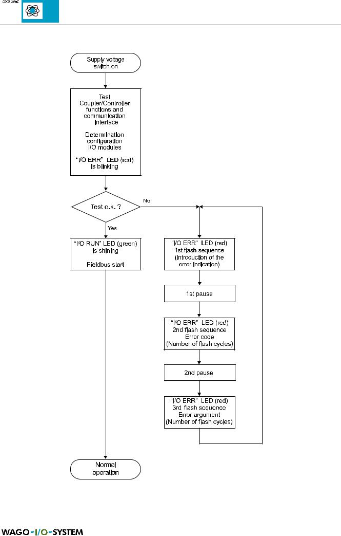 After the supply voltage connection the coupler/controller checks all the functions of its components and the communication interface. The configuration of the I/O modules is then determined. The 'I/O ERR' LED is blinking during the run-up time. The coupler/controller enters then the "fieldbus start" status after the successful run-up. The green "I/O RUN" LED indicates this status. If an error occurs, the red "I/O ERR" goes on blinking in a low frequency. The various types of error are indicated via up to 3 different flash sequences.