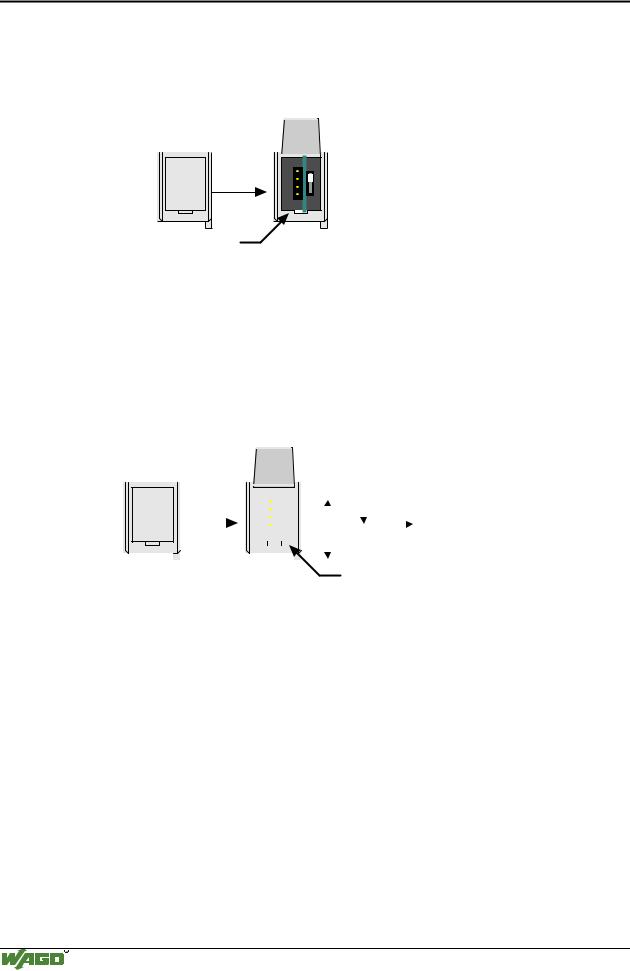 Die Konfigurationsund Programmierschnittstelle befindet sich hinter der Abdeckklappe. Sie wird für die Kommunikation mit WAGO-I/O-CHECK und für die Übertragung der Firmware genutzt.