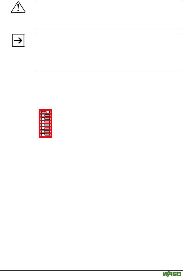Nach Beendigung der Baudrateneinstellung / Baudratenüberprüfung ist die Betriebsspannung auszuschalten, da nur beim Power-On der eingestellte DIPWert als Modul ID zur Berechnung der IDs verwendet wird. Im ausgeschalteten Zustand kann nun die gewünschte Modul-ID (=1 im Auslieferungszustand) auf dem DIP-Schalter eingestellt werden.