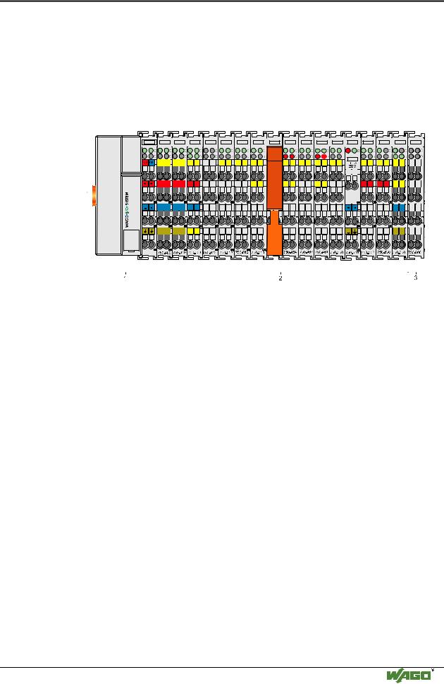 Das WAGO-I/O-SYSTEM 750 ist ein modulares und feldbusunabhängiges E/A-System. Es besteht aus einem Feldbus-Koppler / -Controller (1) und bis zu 64 angereihten Busklemmen (2) für beliebige Signalformen, die zusammen den Feldbusknoten bilden. Die Endklemme (3) schließt den Knoten ab.