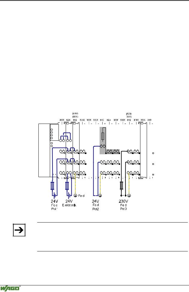 Nur wenn der Schutzleiter auf dem unteren Leistungskontakt benötigt wird oder eine Absicherung gewünscht ist muss eine weitere Potentialeinspeiseklemme 750-601/602/610 hinter der Filterklemme 750-626 eingesetzt werden.