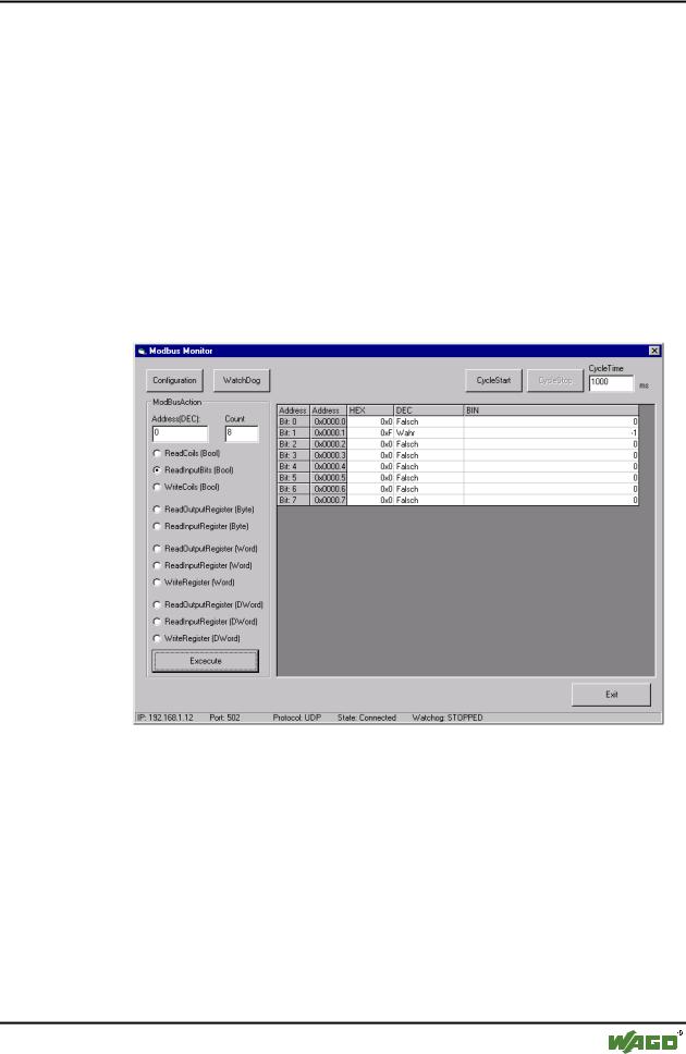 Weitere Informationen und Beispiele finden Sie auf der beiliegenden CD „WAGO DLL Modbus/TCP“ (759-312).
