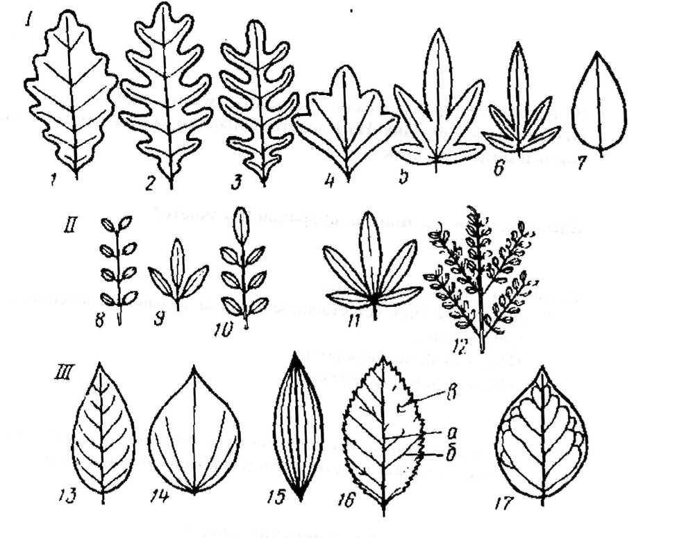 III - жилкование листьев: 13 - перистонервный; 14 -пальчатонервный с пятью базальными жилками; 15 - дугонервный; 16 - совершенноперистонервный (а - главная жилка; 6 - боковые жилки первого порядка, или вторичные; в - третичные); 17 - несовершенноперистонервный