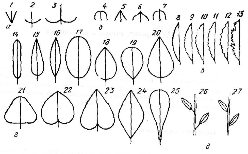 г - форма листовой пластинки: 14 - линейная; 15 - машинная; 16 - продолговатая; 17 - эллиптическая; 18 - яйцевидная; 19 - обратно-яйцевидная; 20 - яйцевидно-заостренная; 21 - широкояйцевидная; 22 - сердцевидная; 23 - сердцевидно-заостренная: 24 - ромбическая; 25 - лопатовидная;
