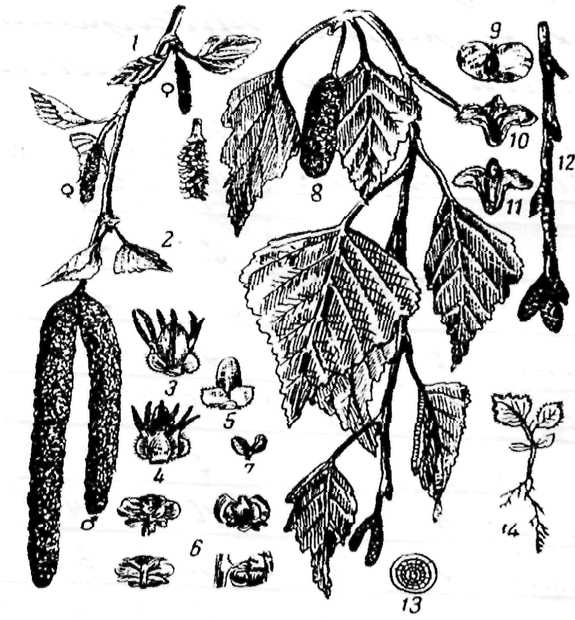 Береза бородавчатая: 1 - верхушка побега с тычиночными и пестичными сережками; 2 - часть пестичной сережки; 3 - пестичное соцветие сверху; 4 - соцветие изнутри; 5 - покровная чешуйка; 6 - тычиночный цветок снизу, изнутри, сбоку; 7 - тычинка; 8 - ветвь с листьями, плодовой и заложившимися тычиночньи сережками; 9 - плод; 10, 11 -чешуйки снаружи и изнутри; 12 - побег в зимнем состоянии; 13 - поперечный разрез побега; 14 - всход. |