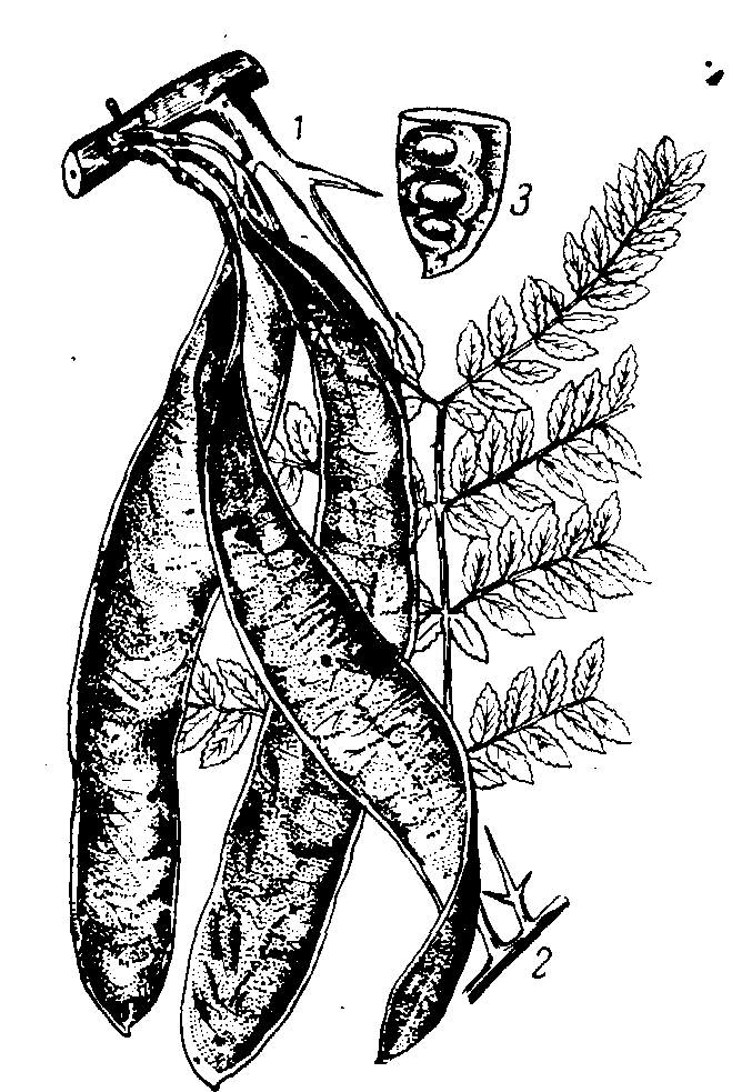 1 - ветвь с плодами и колючкой; 2 - ветвь с листьями; 3 - часть вскрытого плода с семенами. |