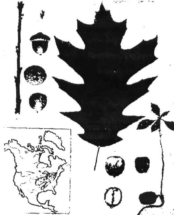 Дуб красный побег, лист, женские цветы, желуди, всход, карта ареала.