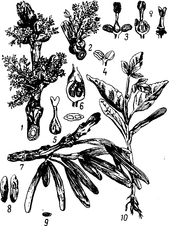 1 - побег с обоеполыми цветками; 2 - пучок пестичных цветков; 3 - обоеполый цветок; 4 - тычинка; 5 - пестик; 6 - продольный и поперечный разрезы завязи; 7 - побег с плодами-крылатками; 8 - семядоли и зародыш; 9 - разрез семени; 10 - всход.