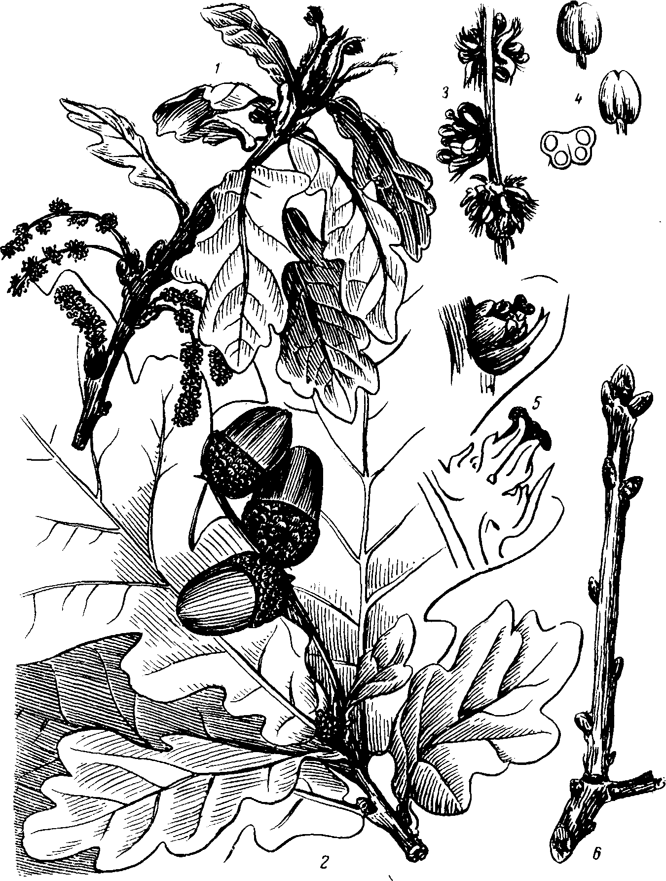 1 - цветущий побег; 2 - ветвь с листьями и плодами; 3 - часть тычиночной сережки; 4 - пыльник (вид сверху, снизу и поперечный разрез); 5 - пестичный цветок (вид сбоку и продольный разрез); 6 - побег с почками. |