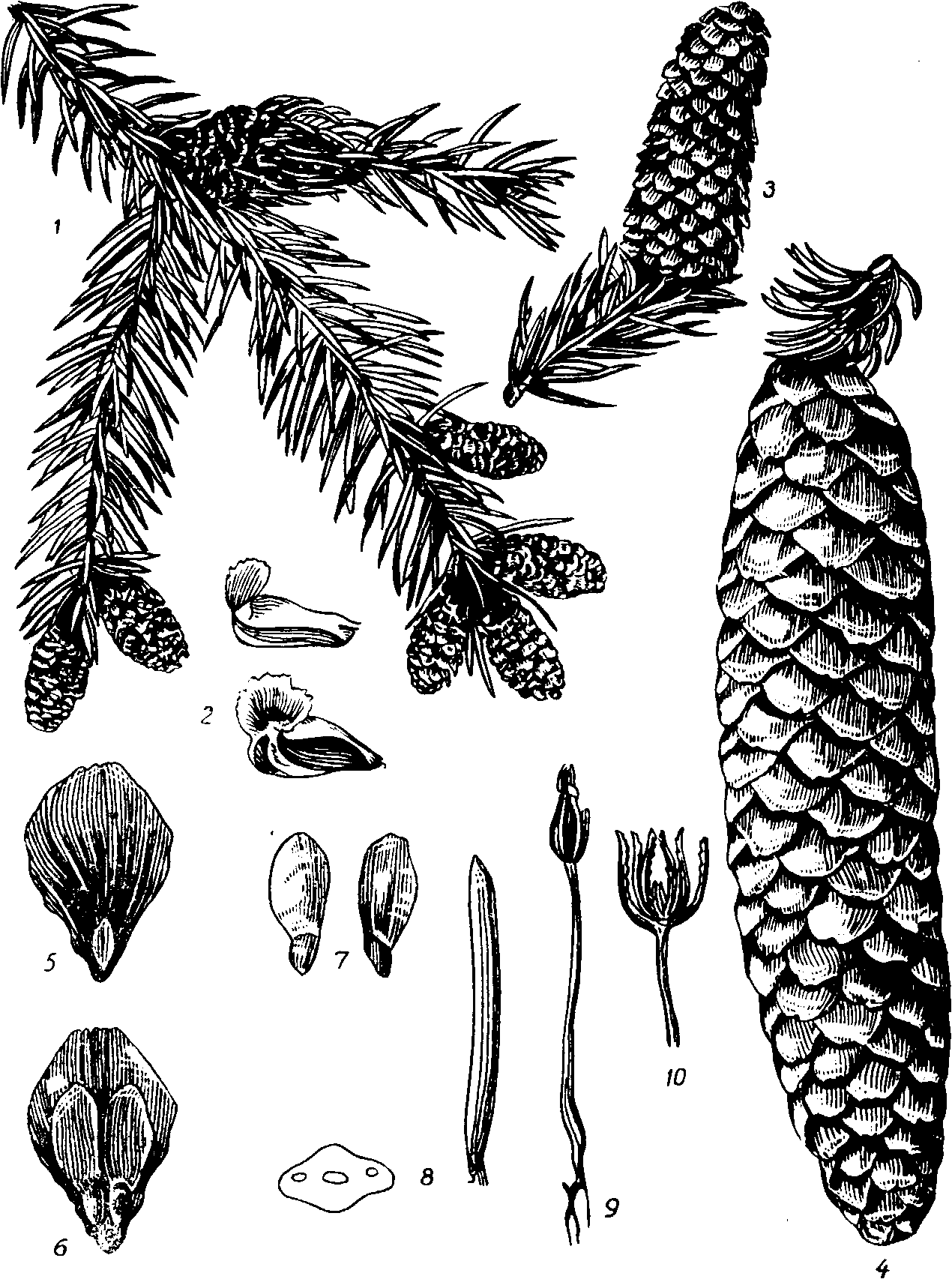 1 — ветвь с мужскими колосками; 2 — тычинки; 3 — побег с женской шишечкой; 4 — зрелая шишка; 5 — чешуя от женской шишки снаружи; 6 — она же изнутри; 7 — семя; 8 — хвоя и поперечный разрез хвоинки; 9 — всход; 10 — вершина всхода.