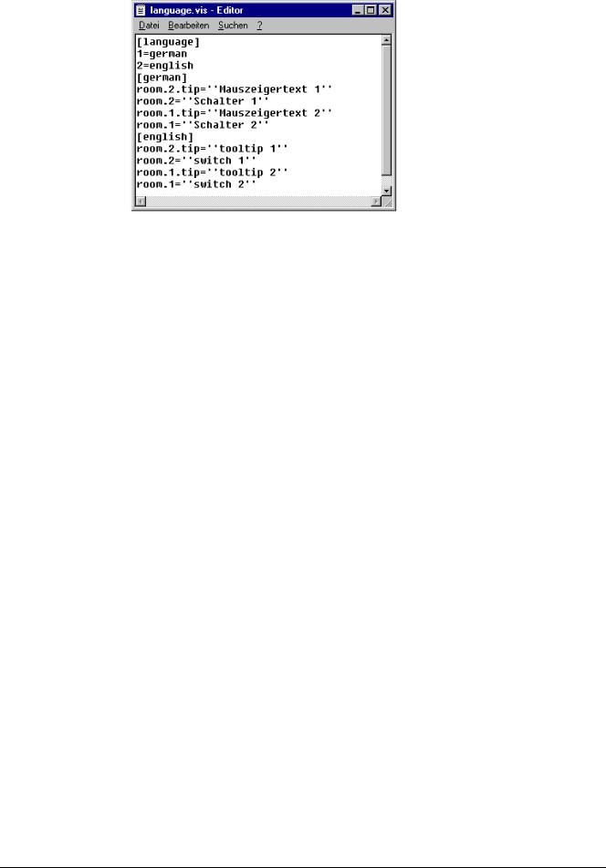 In the input field next to Language you fill in a keyword for the language which is currently used in the visualization, i.e."german" (or "D"). then press the button Save. A file with the extension .vis will be created, which now can be edited by a normal text editor. For example you can open the file by NOTEPAD: