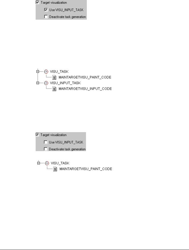 (b)The Target visualization is not controlled by automatically created tasks; the implicitly available POUs MAINTARGETVISU_PAINT_CODE and MAINTTARGETVISU_INPUT_CODE can be called by the application program resp. can be appended to any task: Deactivate task generation is activated: