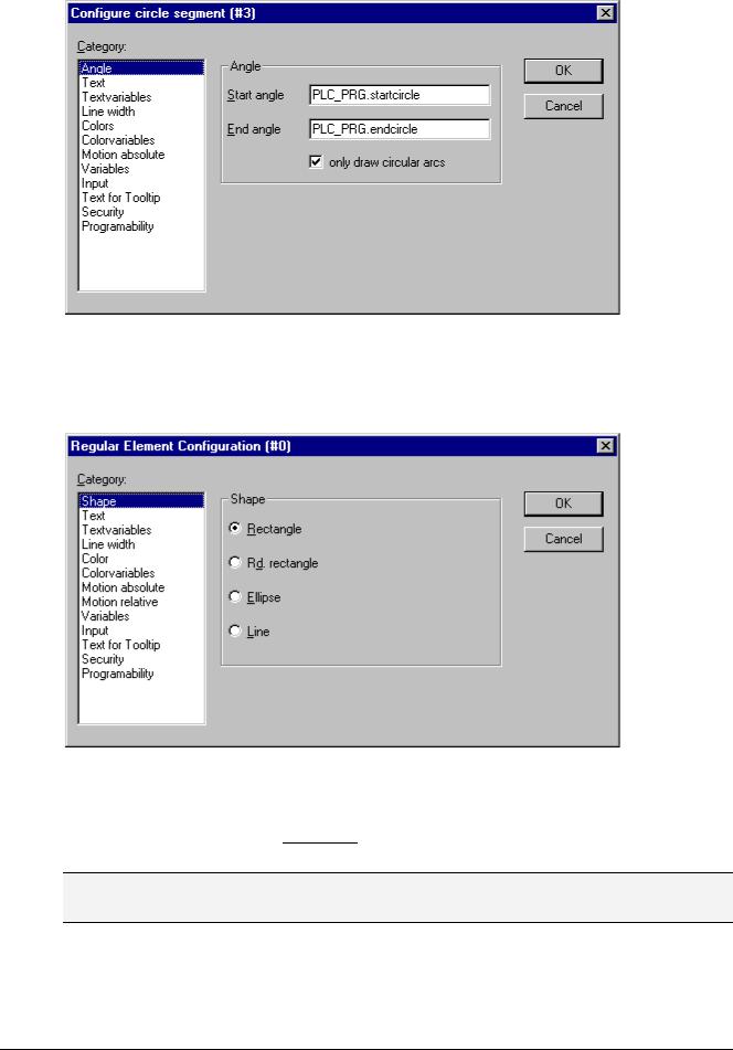 In this dialogs the properties of an element or object are set either by activating options or dynamically by inserting project variables. Besides that the properties can be programmed via the components of a structure variable, which can be defined for each visualization element.