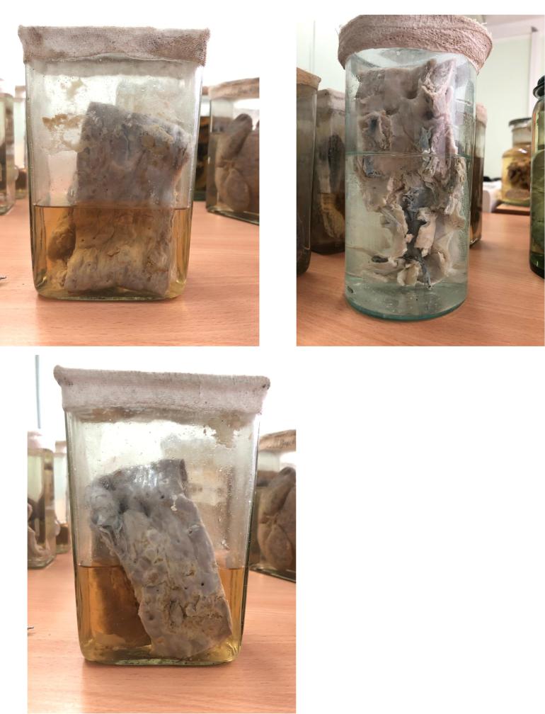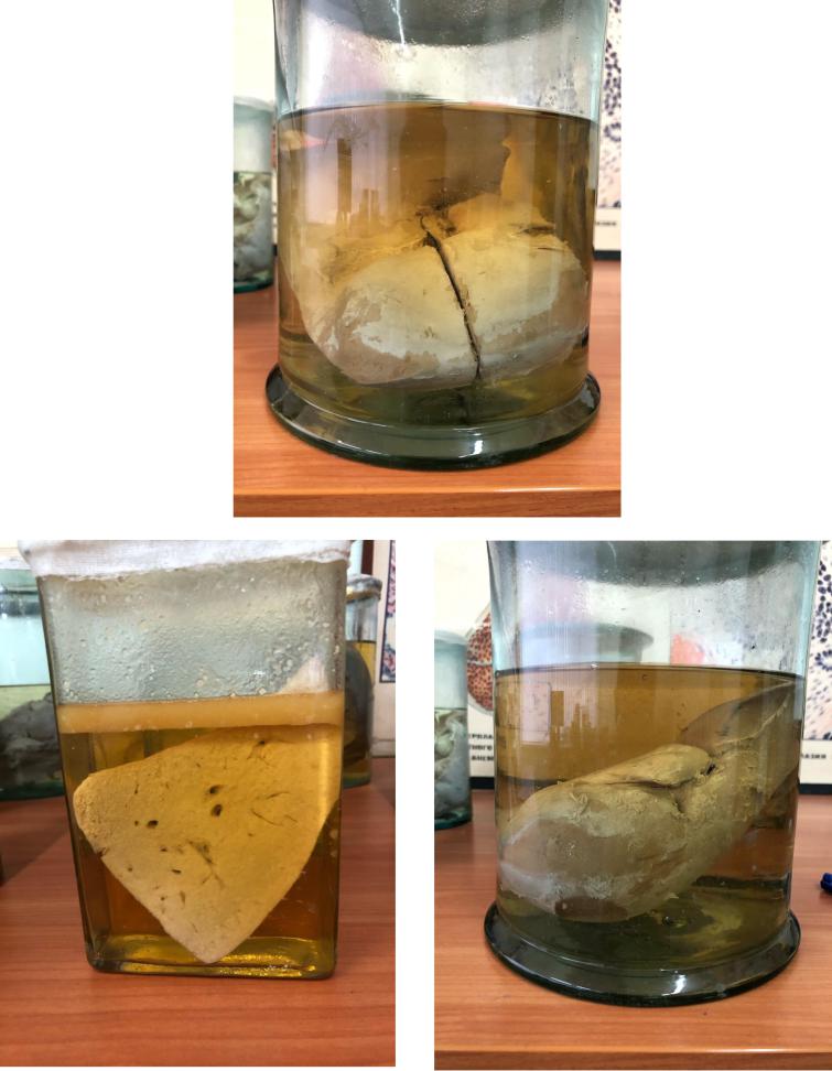 ОПИСАНИЕ: Поверхность органа гладкая, неоднородного желто-коричневого цвета. Капсула органа прозрачная, местами отслоена. Предполагаемая консистенция органа на ощупь дряблая. На разрезе поверхность однородного серо-желтого цвета, губчатая.