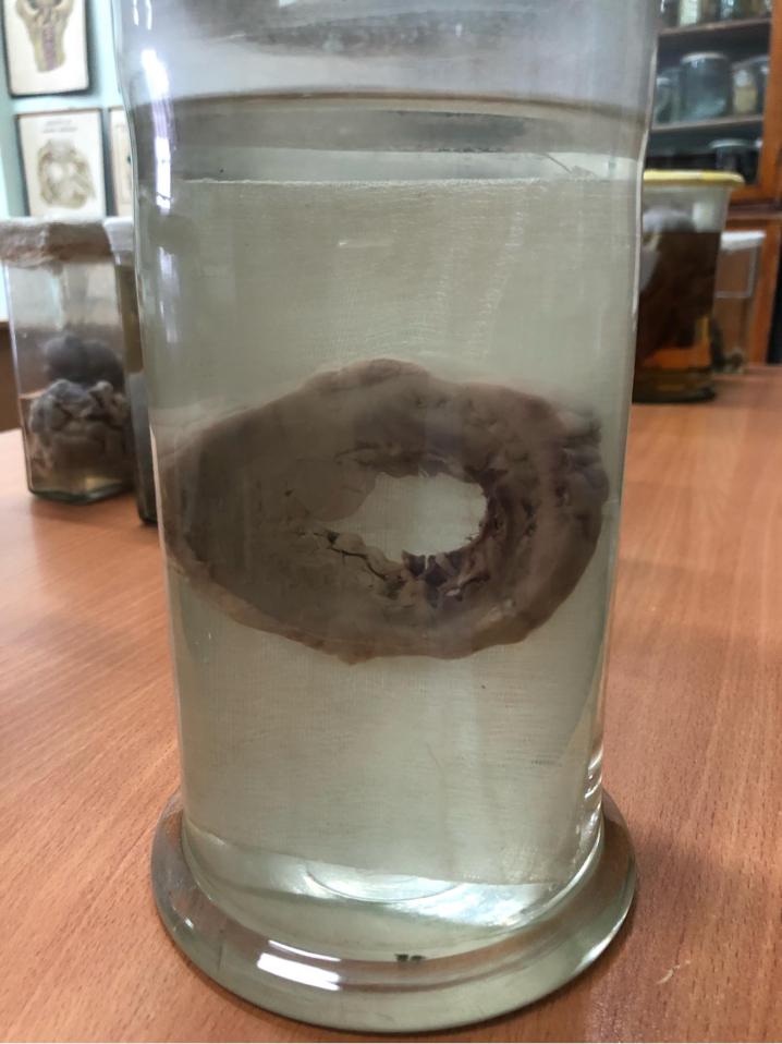 ОПИСАНИЕ: Поверхность мелкобугристая, неоднородного серого цвета (имеются немногочисленные включения желтого цвета), капсула (фасция) белосоватого цвета, местами отслоена. На разрезе резко выражен атеросклероз, поражающий интиму на всем протяжении, видны атероматозные бляшки с изъязвлениями, что привело к формированию пристеночного тромба черного цвета, размером 7х1,5х3 см.