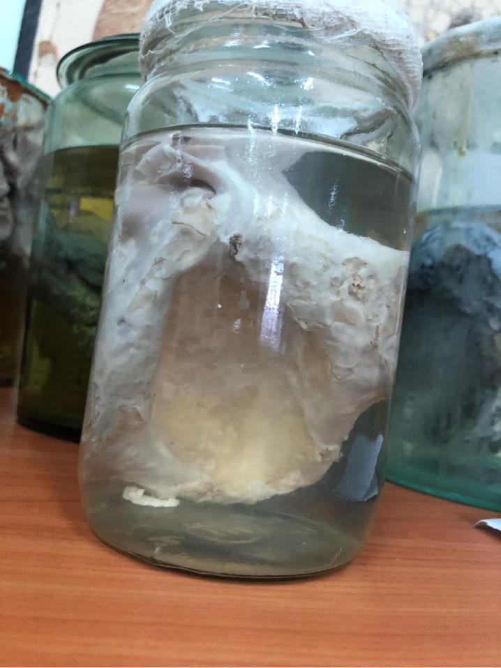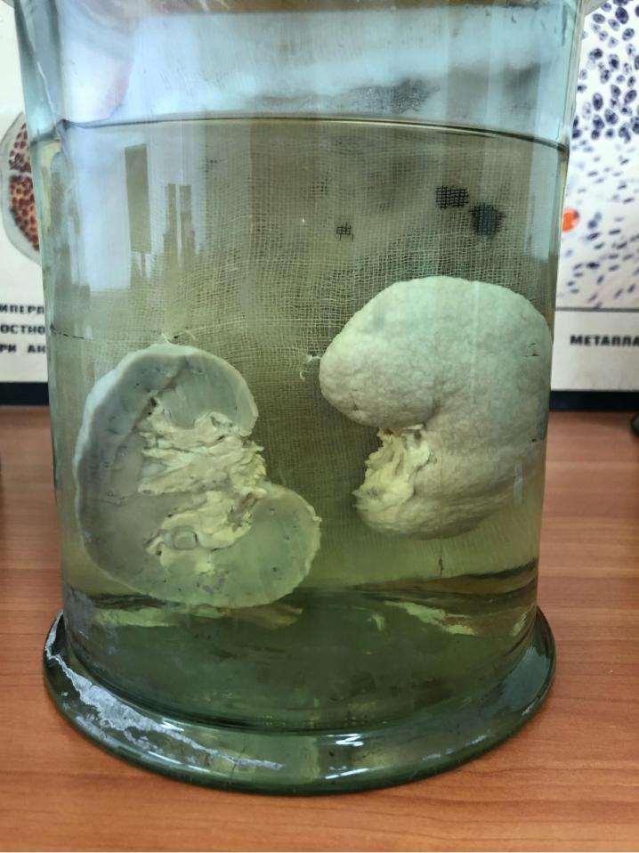 Почка: поверхность мелкобугристая, серого цвета, капсула отслоена. На разрезе поверхность однородная серого цвета, отсутствует граница между корковым и мозговыми слоями