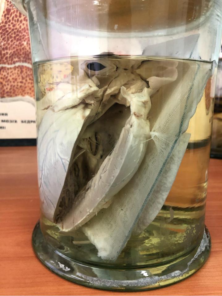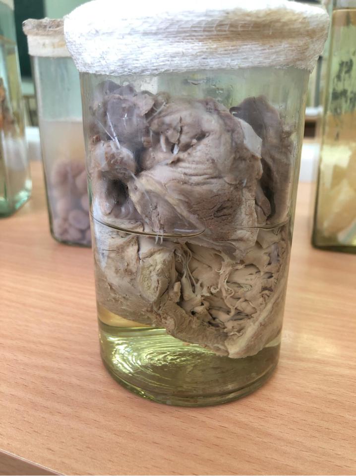 Сердце: Поверхность серого цвета, гладкая, поверхностная оболочка местами отслоена. На разрезе видна утолщенная в размерах стенка миокарда в области левого желудочка.