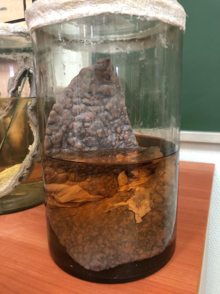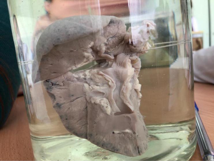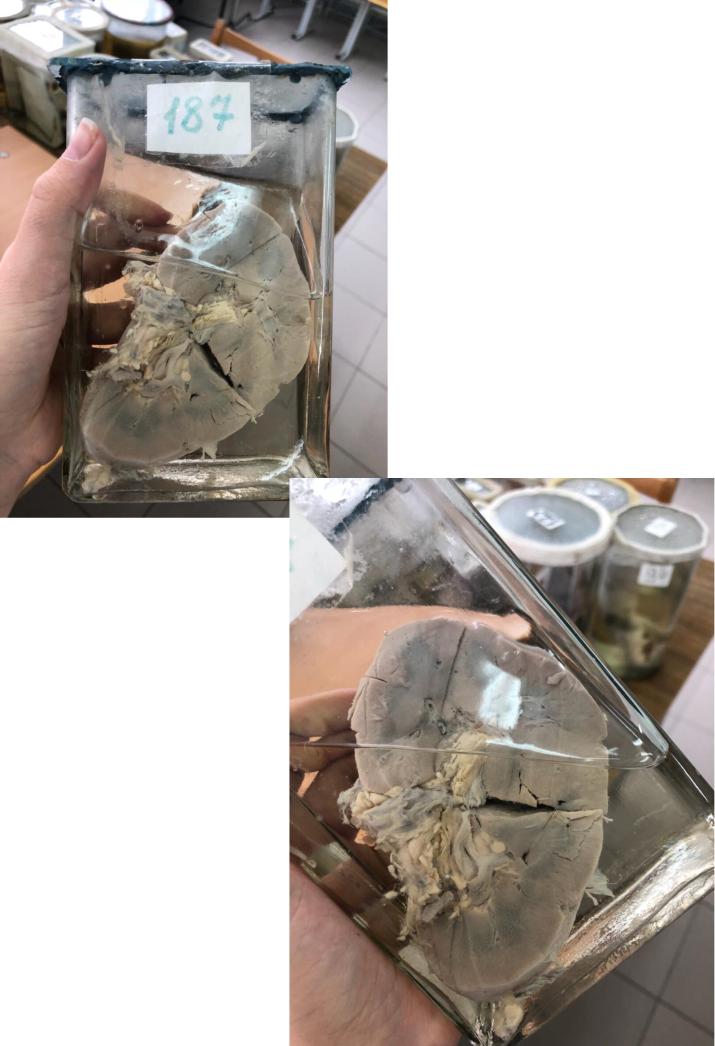 МАКРО 197: ПОЧКА ПРИ СИСТЕМНОЙ КРАСНОЙ ВОЛЧАНКЕ Описание: Поверхность гладкая, неоднородного серого цвета, с черными и белесоватыми крапинками. Капсула