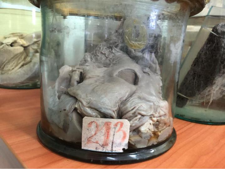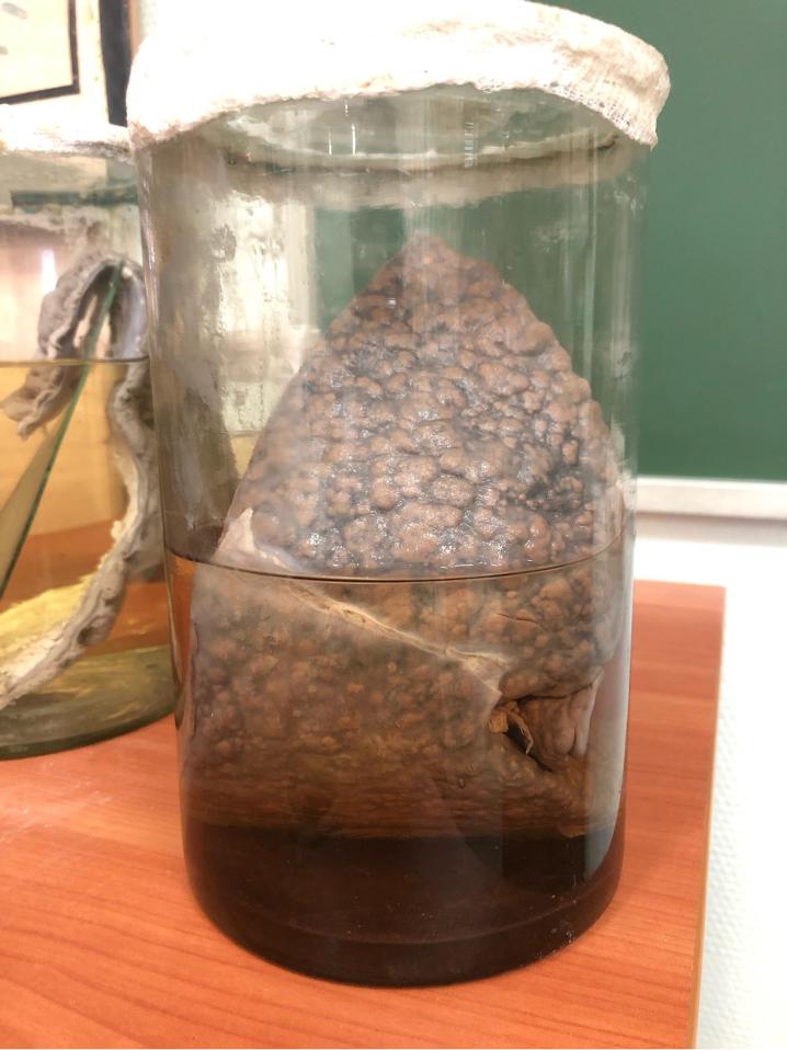 Описание: 18х8х10 см. Поверхность органа бугристая, коричневого цвета с синеватыми прожилками. Капсула прозрачная. Консистенция дряблая. Имеются множественные бугорки серо-розового цвета – скопление соединительной ткани. Заключение: мелкоочаговый цирроз печени.