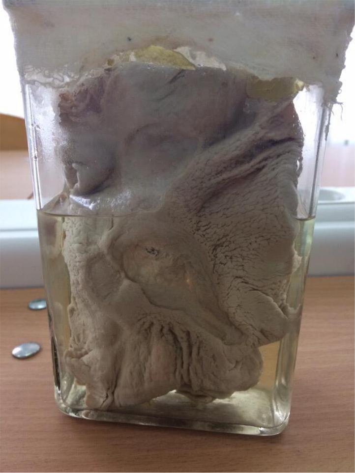 МАКРО 214: ХРОНИЧЕСКАЯ ЯЗВА ЖЕЛУДКА С ПЕРФОРАЦИЕЙ Описание: Поверхность разреза серого цвета, имеется отверстие размером 5х4 см, с четкими ровными краями, овальной формы. Вокруг перфорации отсутствуют очаги воспаления.