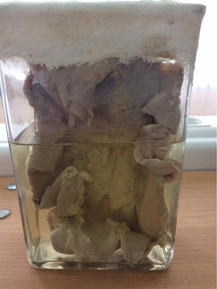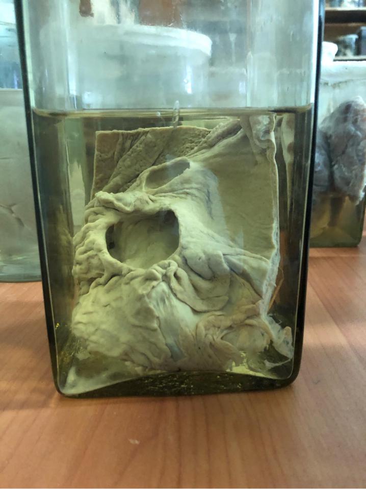 МАКРО 213: ХРОНИЧЕСКАЯ ЯЗВА ЖЕЛУДКА С ПЕНЕТРАЦИЕЙ ( В ПЕЧЕНЬ ИЛИ В ПОДЖЕЛУДОЧНУЮ ЖЕЛЕЗУ) Описание: На разрезе слизистая оболочка желудка серого цвета, со сглаженными складками. Имеется пенетрация с ровными краями, размером 4х3 см. Вокруг пенетрации отсутствуют очаги воспаления и некроза.
