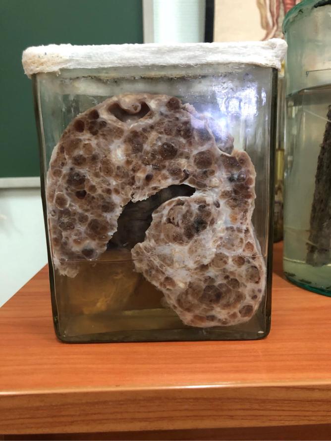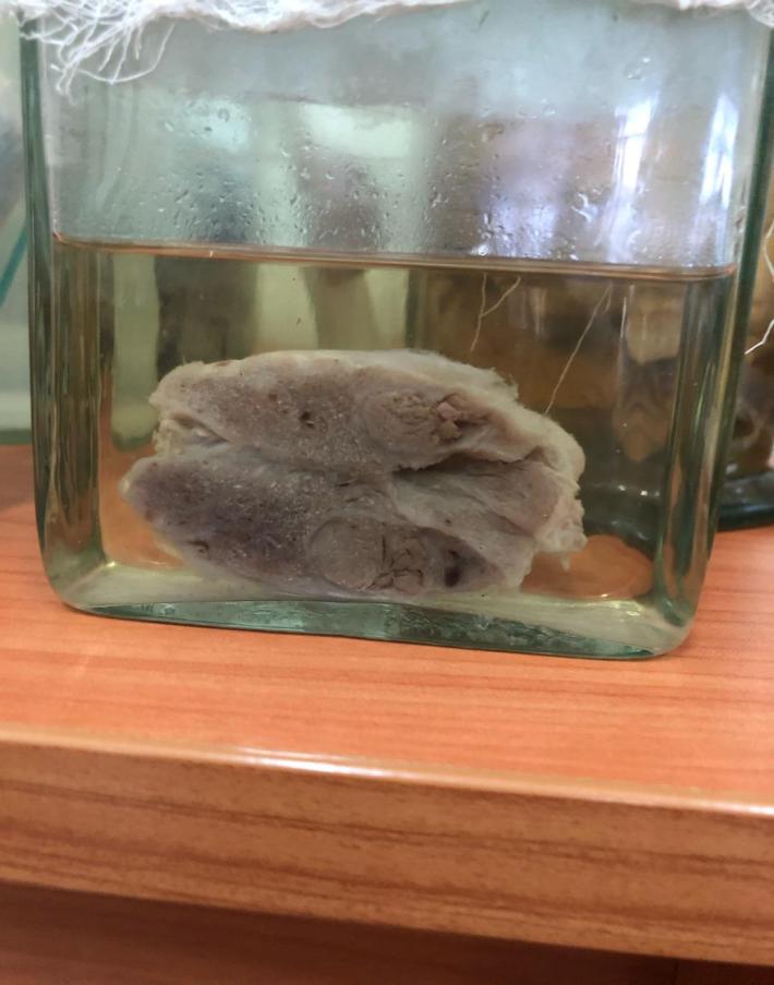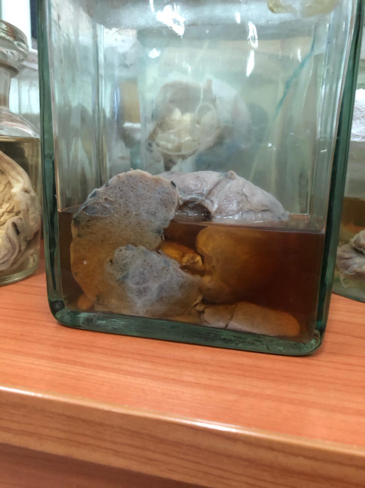 Описание: 8х4х1 см. Поверхность неоднородная, мелкобугристая, серо-коричневого цвета. Капсула белесоватая, полностью покрывает орган. Поверхность разреза неоднородная: на коричневом фоне множественные патологические очаги темно-коричневого цвета, овальной формы, с четкими границами, размером 4х2 см.