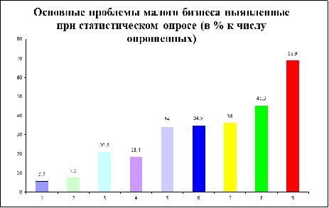 Правда, реальны опасения, что выработанные меры могут быть просто «заболтаны» и сведутся к формально-бюрократическим процедурам. Чтобы подобного не случилось, Евгений Примаков предлагает ежегодно на заседании Государственного совета рассматривать ход и промежуточные результаты выполнения этой Концепции. Сворачиванию малого бизнеса способствует множество проблем. Некоторые из них представлены в виде диаграммы «Основные проблемы малого бизнеса выявленного при статистическом опросе».
