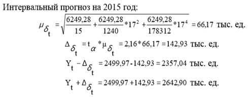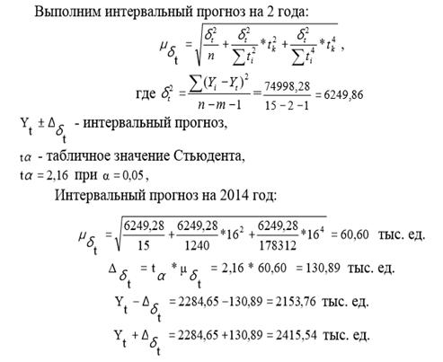 Таким образом, если выявленная тенденция по полиномиальной функции сохранится, то в следующие два года с вероятностью 99,94% можно ожидать увеличение количества малых предприятий, причем в 2014 г. их количество будет составлять от 2153,76 до 2415,54 тыс. ед. , а в 2015 г. - от 2357,04 до 2642,90 тыс. ед..