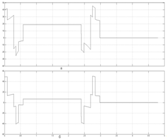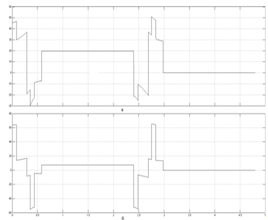 Рис. 3.3 Диаграммы момента развиваемого двигателем 1-го звена (а) и 2-го звена (б) манипулятора с учётом массы двигателя Д2, равной 20 кг и момента инерции якорей двигателей Д1 и Д2, равном 3,83 10-3 кгм2 и КПД редукторов равных 100%.