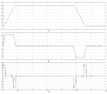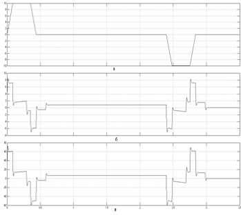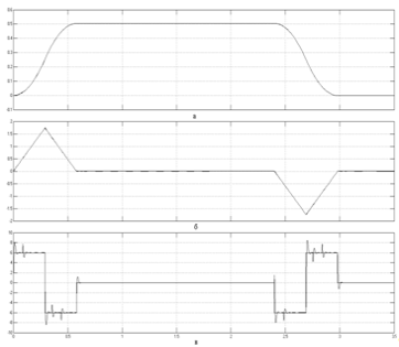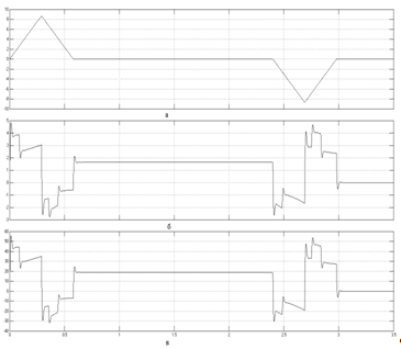 сигналов задания скорости (а), задания тока (б) и диаграмма момента (в) в СУЭП