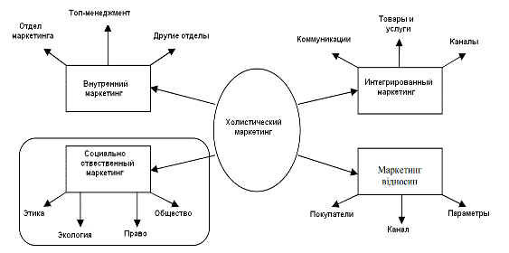 Тенденция переноса акцента с товара на покупателя и с продаж на удовлетворение потребностей потребителя, сформировавшаяся в последние годы в странах с рыночной экономикой, требует расширения информации о потребностях и образе жизни покупателя. Холистический маркетинг (все компоненты процесса рассматриваются как единое целое, а не совокупность элементов) включает в аналитический процесс все составляющие цепи создания стоимости и оценивает влияние этих процессов на потребителей, дистрибьюторов, дилеров, поставщиков, сотрудников и акционеров. Холистический маркетинг (или целостный маркетинг) ставит задачу сотрудничества потребителя и компании. Целостность - основная концептуальная идея современного маркетинга, которая определяет организационную структуру компании и задачи менеджмента маркетинга.