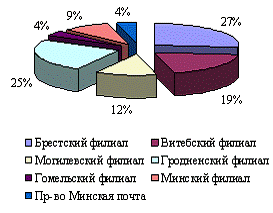 Анализируя построенную выше диаграмму, следует отметить, что наиболее интенсивно пользуются услугой жители Брестской и Гродненской областей (27% и 25% соответственно), за ними следует Витебская область - 19%, далее идет Могилевская область - 12%, Минская область - 9%, гомельская область и Минск - 4%.