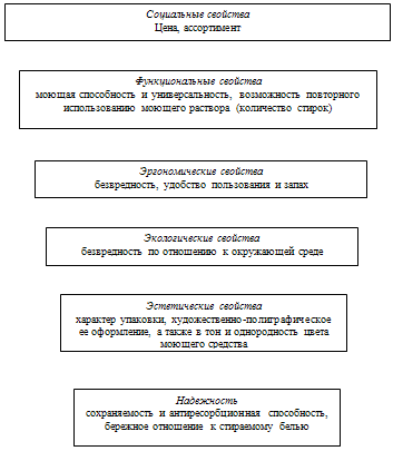 Потребительские свойства синтетического моющего средства характеризуют как моющее средство, так и эффективность моющего процесса. Номенклатура потребительских свойств включает: социальные, функциональные, эргономические, экологические, эстетические свойства и их показатели, а также показатели надежности (рисунок 2.1).